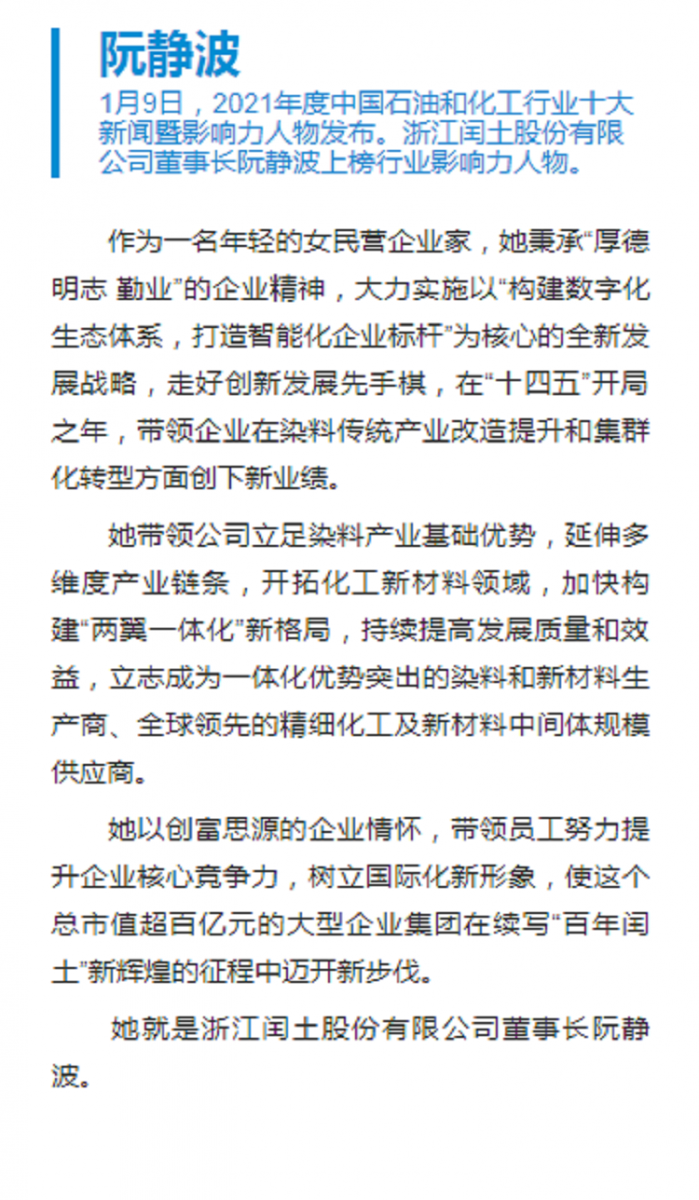 2022年1月9日,由中國石油和化學工業(yè)聯(lián)合會指導,《中國化工報》社有限公司主辦的“2021年度石油和化工行業(yè)十大新聞暨影響力人物發(fā)布盛典”采用線上直播的形式舉行。浙江閏土股份董事長阮靜波榮膺“2021年度中國石油和化工行業(yè)影響力人物”。